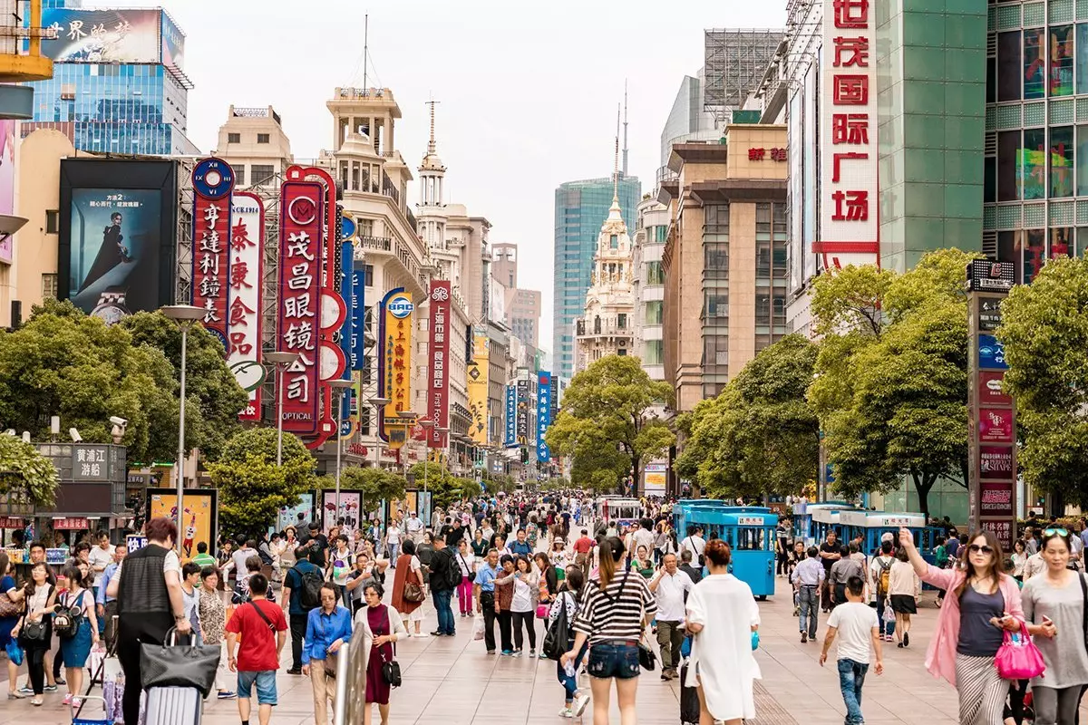 Første stopp er den populære gaten Nanjing Road. Den ligger like i nærheten og er en av verdens travleste handlegater, med ca. 1 million besøkende hver eneste dag. Gaten er 5,5 km lang og dermed også den lengste handlegaten i verden. Den går fra The Bund i øst til Jing’an-tempelet i vest. Her er det både merkevarebutikker, tradisjonelle butikker, vestlige fastfood-restauranter og butikker med silke og suvenirer.