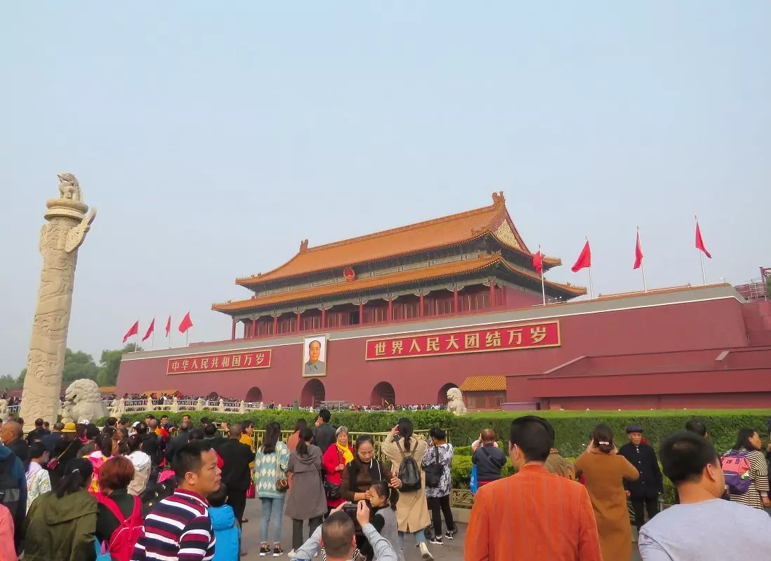 Fra plassen går du til Den forbudte by, som ligger bak Den himmelske freds port. Dette er stedet hvor Mao den 1. oktober 1949 utropte Folkerepublikken Kina.