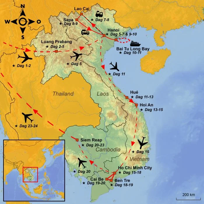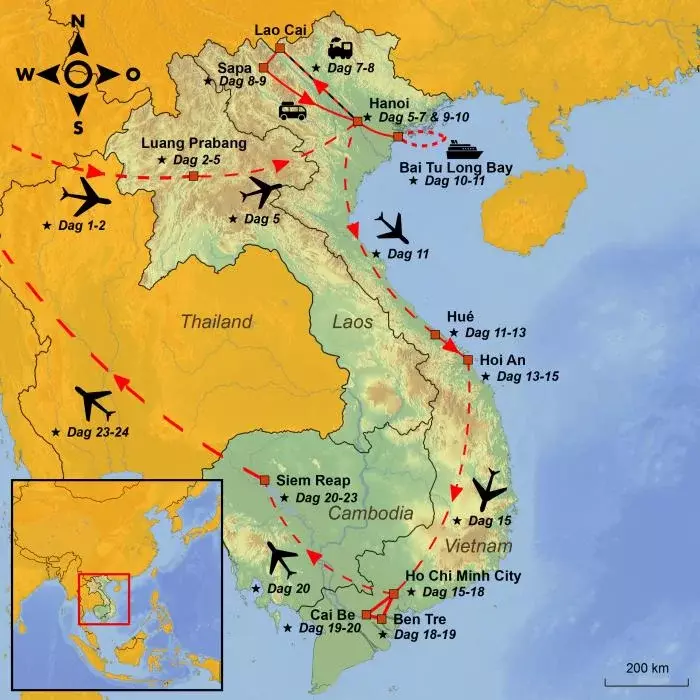 Reisen starter i Laos, i den tidligere kongebyen Luang Prabang. Med sin avslappede stemning og velbevarte kolonistil er dette et høydepunkt i seg selv. Her kan du se munker i oransje drakter samle inn almisser, nyte utsikten fra Phousi-fjellet, ta et forfriskende bad ved det vakre Kuang Si-fossefallet og utforske byens nattmarked fylt med gatemat og kunsthåndverk.