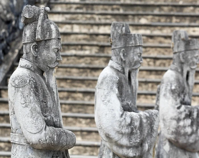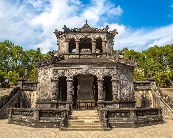 Deretter går turen videre til keiser Khai Dinhs grav, som skiller seg markant fra de andre keisergravene i området. Gravkomplekset ble oppført tidlig på 1900-tallet, og forener tradisjonelle vietnamesiske elementer med europeisk barokk og gotikk. Resultatet er en både storslått og detaljrik arkitektonisk opplevelse, en hyllest til den avdøde keiseren som også vitner om hans fascinasjon for vestlig kunst og kultur.
