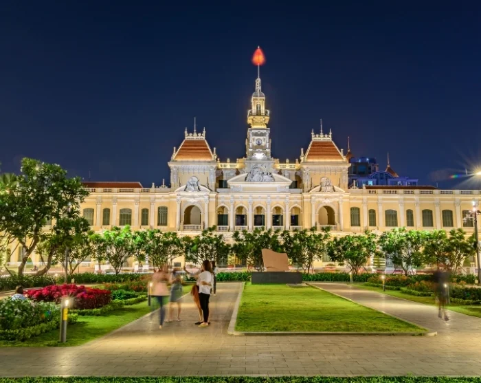 Ved skumringstid kan du rusle nedover Nguyen Hue-promenaden, omgitt av blomster, fontener og stemningsfull arkitektur. Her får du oppleve det livlige bylivet når lokale samles med gateartister, dansere og unge familier i et sjarmerende virvar. Stemningen er avslappet og livlig, og alt toppes rundt det opplyste rådhuset.