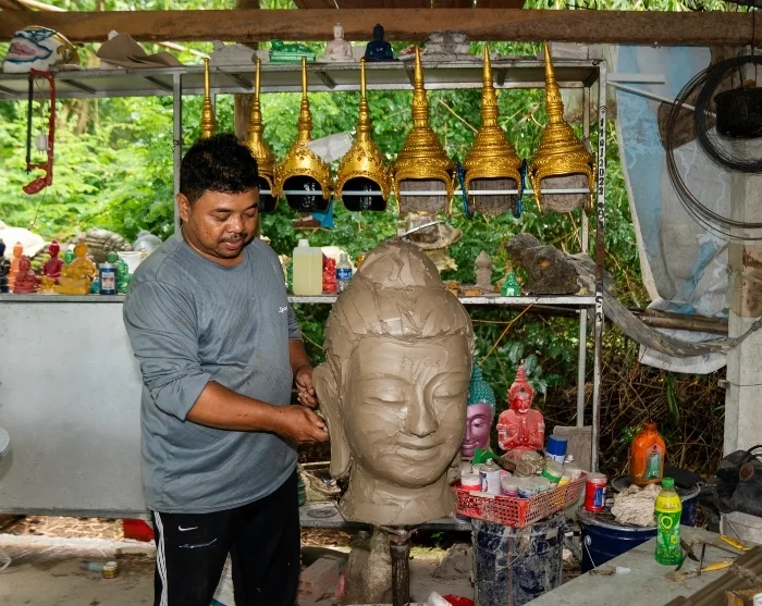 Turen fortsetter med et besøk hos en dyktig khmer-kunstner som lager statuer og masker til områdets pagoder.