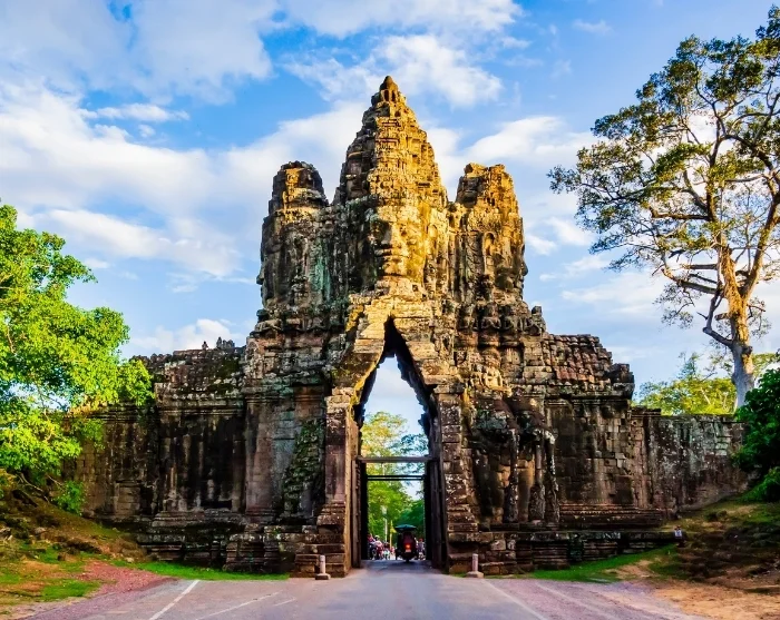 Dagen starter ved Sørporten til Angkor Thom, hvor statuer av gode og onde guder vokter inngangen. Herfra fortsetter du til det ikoniske Bayon-tempelet, kjent for de hundrevis av smilende ansiktene som pryder de høye tårnene. De detaljerte basrelieffene er spesielt imponerende, med scener som skildrer både hverdagsliv og de store slagene mellom khmerene og de gamle thailenderne.