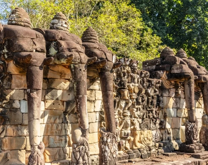Opplev også Elefantterrassen, hvor en lang rekke utskårne elefanthoder danner en mur. Herfra kunne kong Jayavarman i sin tid ha full oversikt over hæren sin. Rett i nærheten finner du Terrassen for de spedalske kongene med en statue av Yama, dødsguden i hinduistisk mytologi.