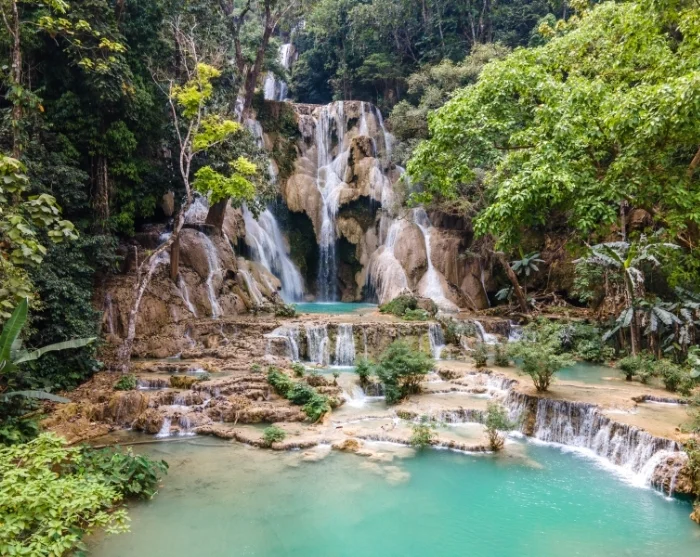 Etter en deilig lunsj går turen 30 km sørover til Kuang Si-fossen. Omgitt av frodig, tropisk jungel strømmer vannet i kaskader over tre nivåer nedover en bratt åsside. Det høyeste fallet er på 60 meter, og på det nederste nivået kan du bade i det turkise, rolige vannet.