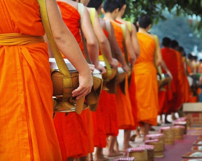 Hver morgen, i de tidlige morgentimene, utspiller det seg en helt spesiell seanse i Luang Prabang. Flere hundre munker vandrer stille gjennom byens gater for å samle inn almisser. Alle familier sender en representant ut på gaten med mat eller drikke, som blir delt ut i munkenes boller. Det er vanskelig å ikke la seg berøre av den respektfulle stillheten og verdigheten dette daglige ritualet gjennomføres med.