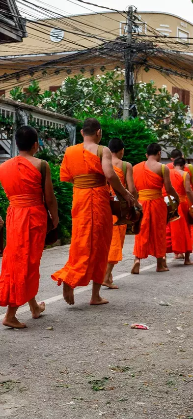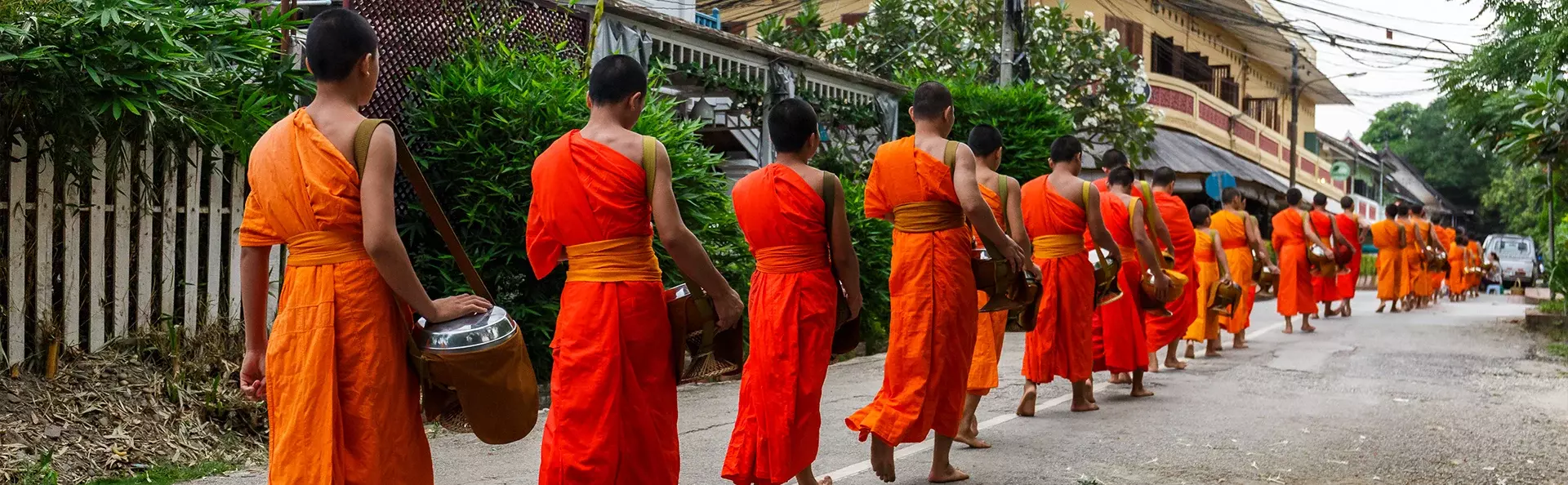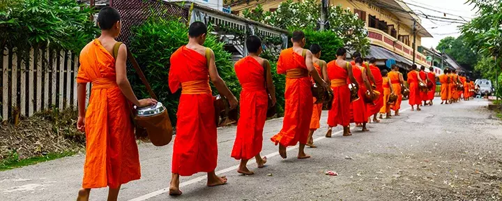 Hver morgen i de tidlige morgentimene utspiller det seg en helt spesiell seremoni i Luang Prabang. Flere hundre munker beveger seg stille gjennom gatene for å samle inn almisser. Hver familie sender en representant ut på gaten med mat eller drikke som fordeles i munkenes boller. Det er vanskelig å ikke la seg gripe av den respektfulle stillheten og verdigheten som preger dette daglige ritualet.