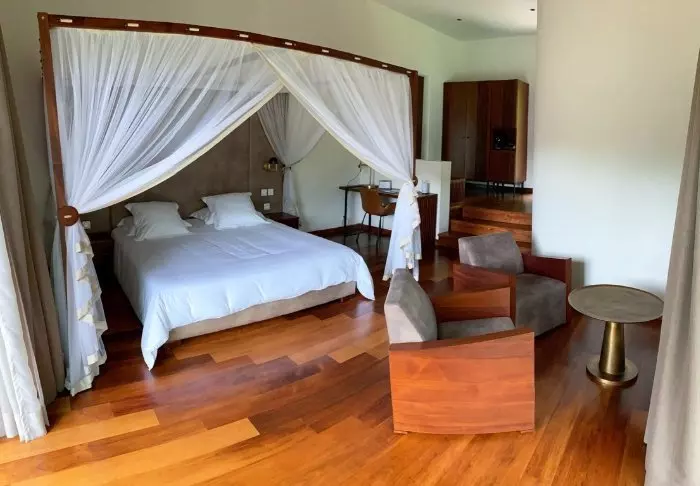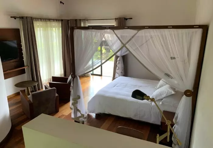 Bungalowene er noe helt for seg selv! Hver bungalow har bad med et frittstående badekar, en privat balkong med utsikt over innsjøen, fasiliteter for å lage kaffe og te, utsøkt bomullssengetøy, minibar og Wi-Fi (som i ekte Madagaskar-ånd kan være litt ustabilt). Bungalowene er på to nivåer, og har plass til både en seng og et lite avslapningsområde. De er også innredet i dempede, nøytrale farger.