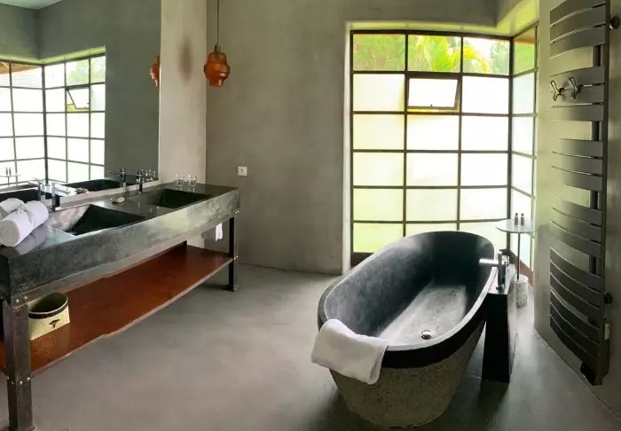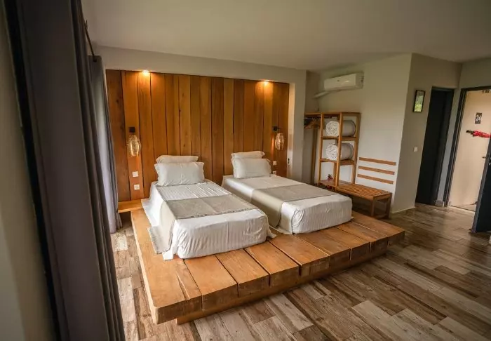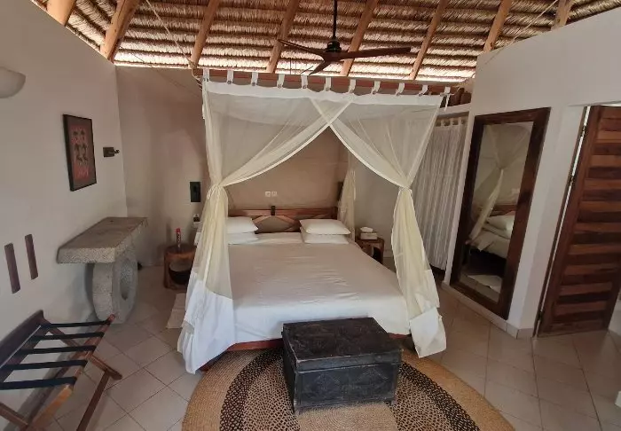 Innredningen er enkel og naturlig, med tregulv, store senger med myggnett, og vakre detaljer i sisal og tekstil. Her finner du aircondition, Wi-Fi, sikkerhetsboks og minibar, og badene er romslige og lyse, med både dusj og toalettartikler.