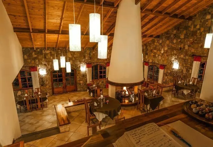 Måltidene inntas i restauranten, som nesten minner om et felleskjøkken på en folkehøgskole – med lange bord og et salongområde der du kan sitte og slappe av og nyte noe godt å drikke før middag.
