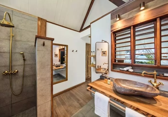 Alle bungalowene har naturligvis egne bad. Dusjen er utendørs, slik at du alltid er nær naturen.