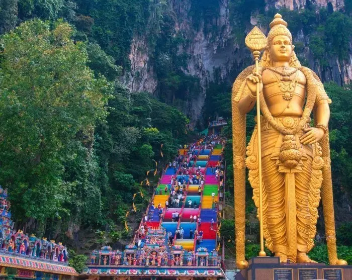 Du fortsetter til KL Central Station, der du skal ta toget ut av byen til den hinduistiske helligdommen Batu Caves. Den består av flere huler, og her kan du se templer, religiøse statuer og fargerike veggmalerier. Det mest imponerende synet er den enorme, gyldne statuen av Lord Murugan, som passer på den regnbuefargede trappen med 272 trinn. Trappen fører opp til hulene, og herfra kan du beundre den fantastiske utsikten over Kuala Lumpur.