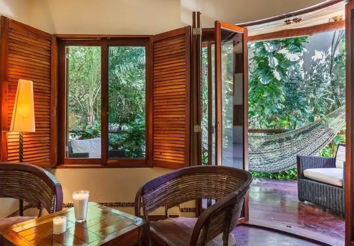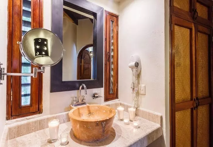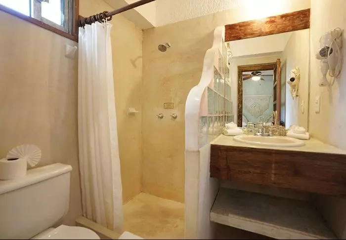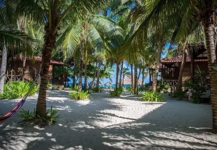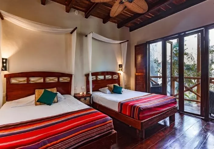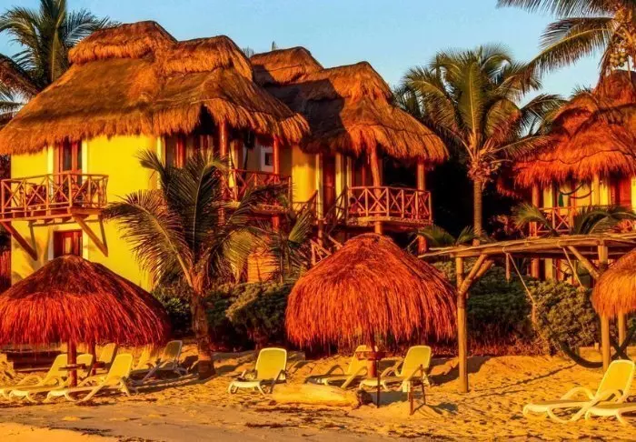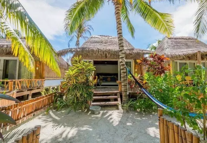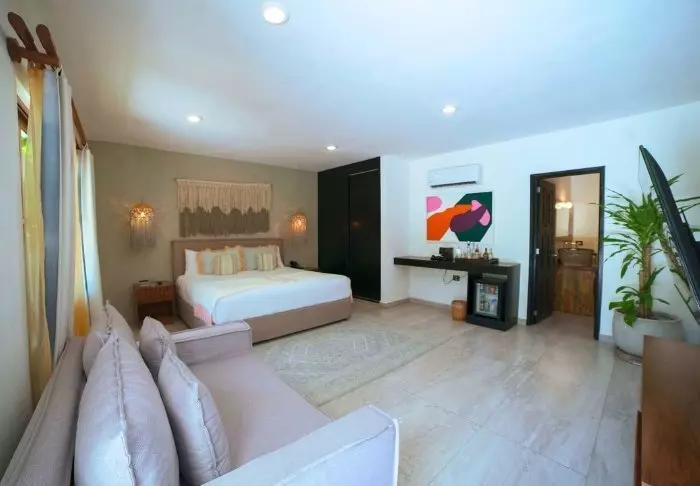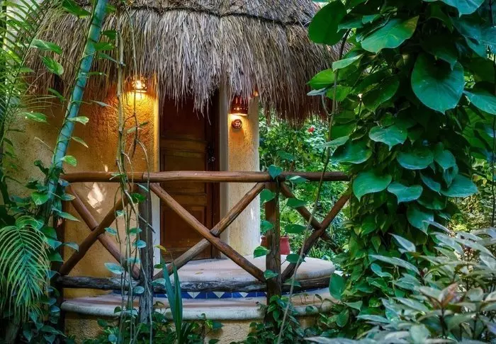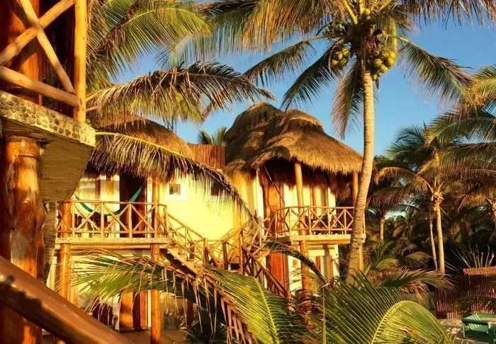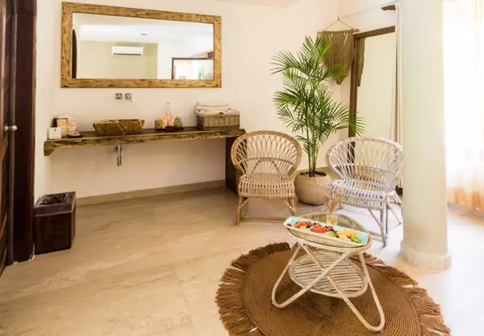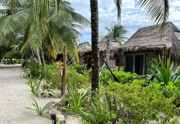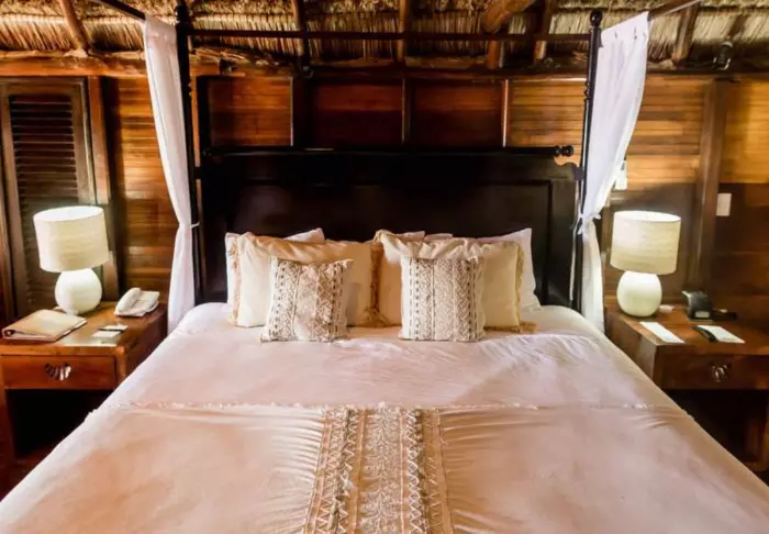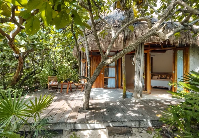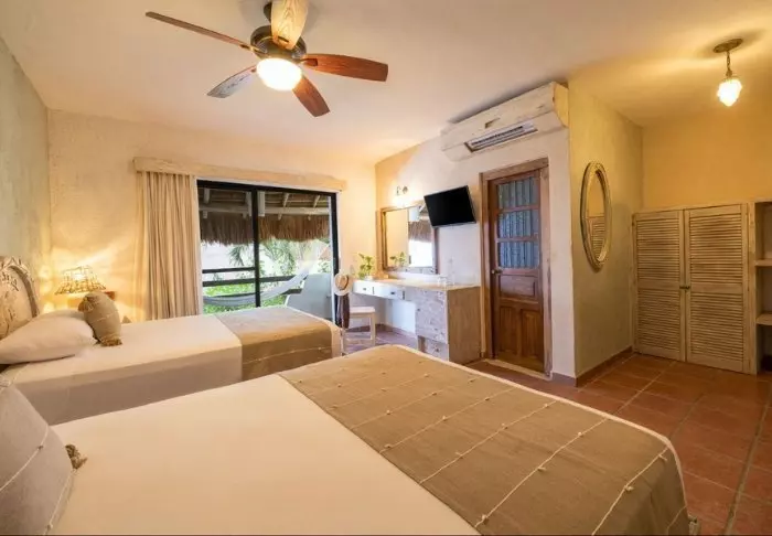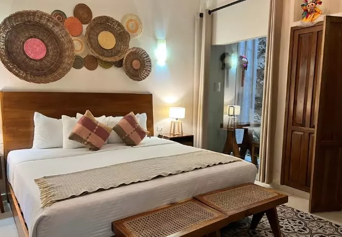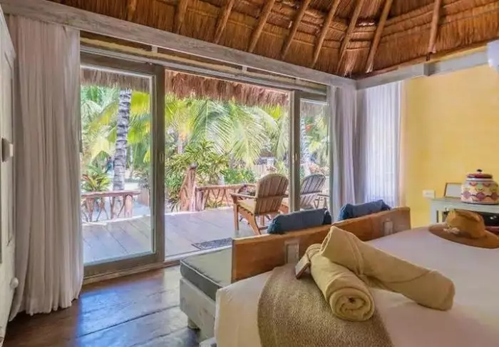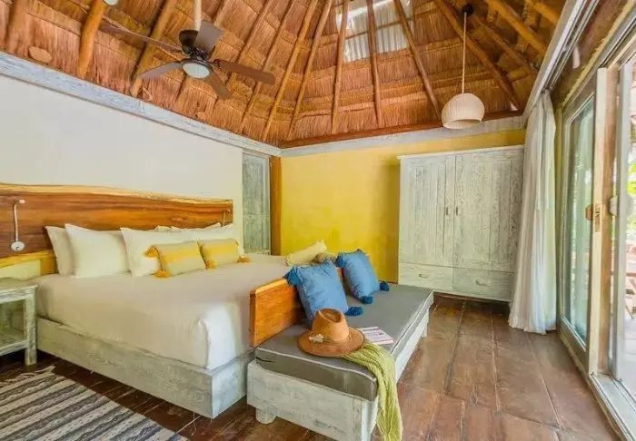 Du bor i sjarmerende hytter som er bygd av naturlige materialer, inkludert med et tak laget av tørkede palmeblader. Rommene er romslige og elegant innredet med en harmonisk blanding av lyse farger, fargerike meksikanske tepper og puter, samt vakre mørke tregulv og møbler.