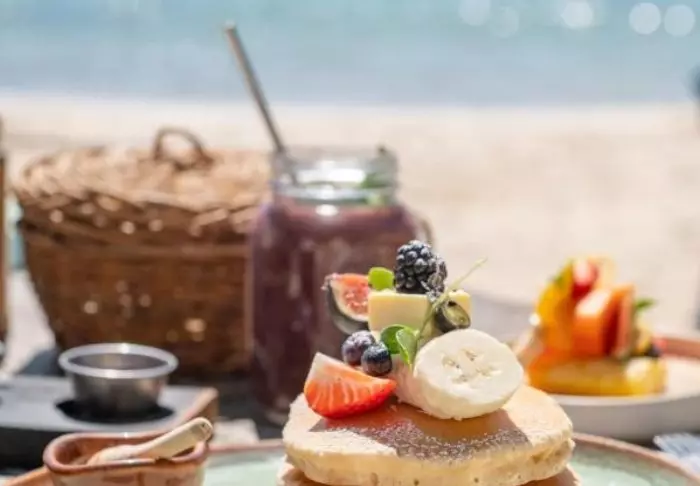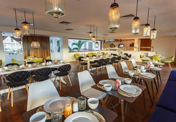 Hotellet har to restauranter: en hovedrestaurant, som er åpen hele dagen, og en sushirestaurant, som bare er åpen om kvelden. I hovedrestauranten serveres frokosten som en overdådig buffé med et stort utvalg av frukt, brød, bakverk, egg og deilig ferskpresset juice. Å nyte frokosten under åpen himmel i tropiske omgivelser til lyden av bølgene som forsiktig bryter mot kysten, er helt enkelt magisk.
