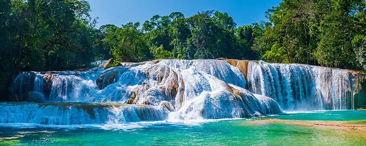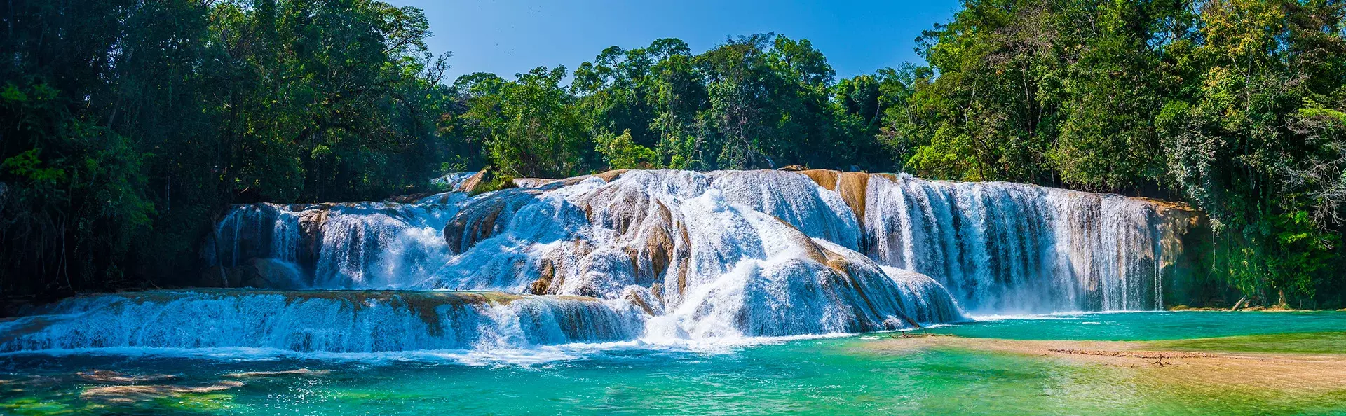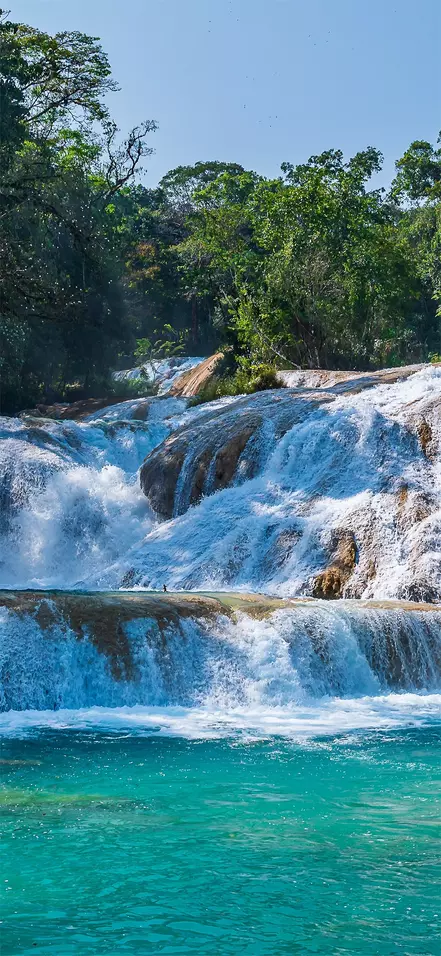 Det første stoppet er ved Agua Azul-fossene (de blå fossene), som er en serie brusende fosser der turkisblått vann strømmer ned over hvite kalksteinsavsatser i flere nivåer. Vannets karakteristiske farge skyldes det høye innholdet av mineraler og kalk som reflekterer sollyset og skaper et nesten eventyrlig bakteppe. Fossene ligger midt i frodig regnskog, og langs elven dannes små, naturlige bassenger der du kan ta et forfriskende bad. Neste stopp er Misol-Ha-fossen, som er en enkeltstående foss på omtrent 35 meter, som dramatisk faller ned i en smaragdgrønn lagune midt i regnskogen. En liten sti fører bak fossen, der du kan stå i ly av det brusende fallet og oppleve naturkreftene på nært hold.