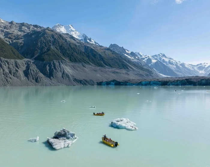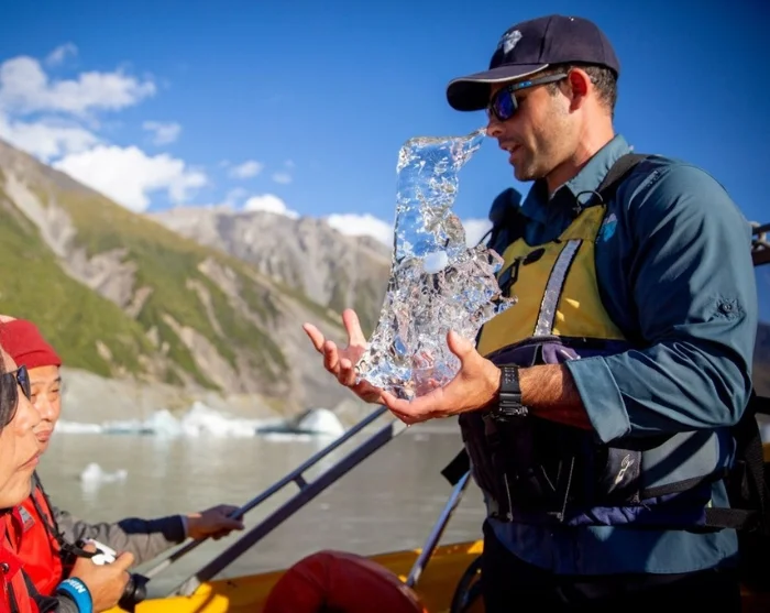 Ved ankomst til Tasman-sjøen får du utdelt redningsvest og går om bord i en spesialbygget, motorisert pontongbåt som enkelt kan manøvrere rundt på sjøen. Her er du omgitt av flytende isfjell i alle mulige former og størrelser – og selvfølgelig den mektige breen i enden av sjøen. Kanskje får du også oppleve at breen kalver – det vil si at en isbit brekker av og faller i vannet. Det er ikke bare spektakulært å se på, men også en trist påminnelse om hvordan global oppvarming påvirker Tasman-breen