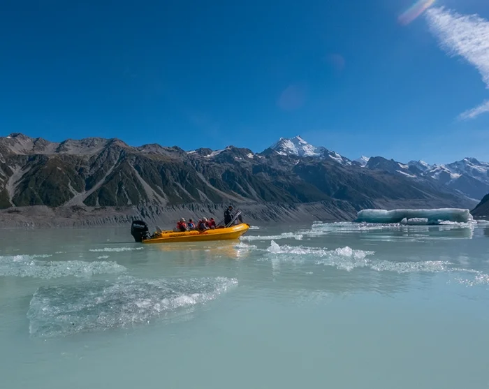 Båten gir trygg tilgang til områder som ellers er utilgjengelige i New Zealands brelandskap.