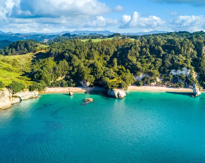 Etter lunsj (for egen regning) fortsetter turen til den berømte klippeformasjonen Cathedral Cove, som er et av New Zealands mest ikoniske naturfenomener.