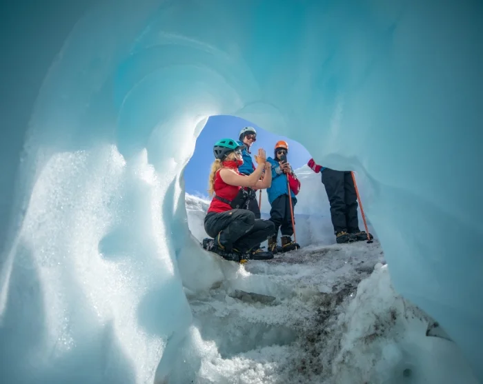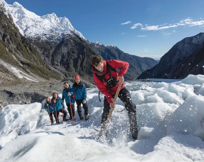 Så venter en ubeskrivelig vakker helikoptertur over regnskogen og inn over breens blå islandskap. Underveis kan du nyte utsikten til de sørlige Alpene og det dramatiske isfallet, før helikopteret lander på en trygg del av breen.