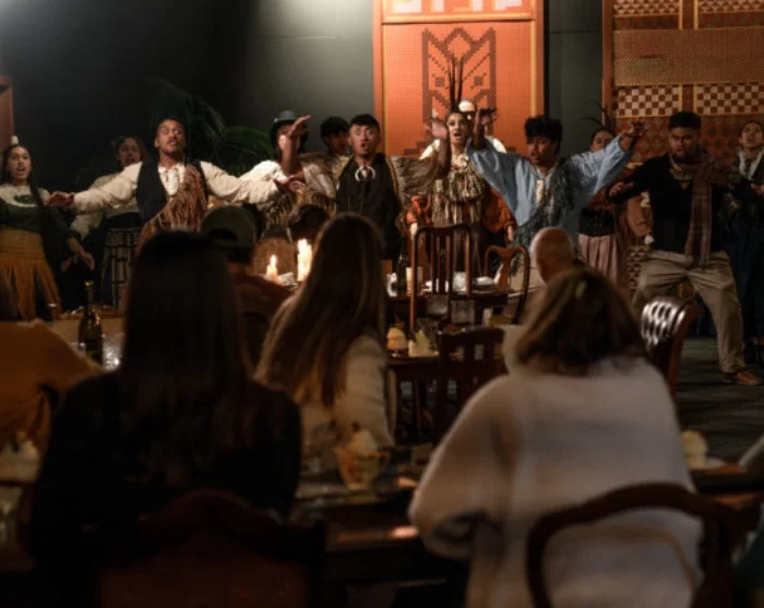 Etter opptredenen blir du geleidet gjennom skogen til en overdådig treretters maori-fusjonsmiddag. Menyen endres etter årstidene og byr på retter tilberedt i en tradisjonell jordovn (hāngī) samt moderne retter med lokale ingredienser som kawakawa, pikopiko og røkte spesialiteter. Måltidet nytes ved langbord, noe som gir rom for fellesskap og gode samtaler.