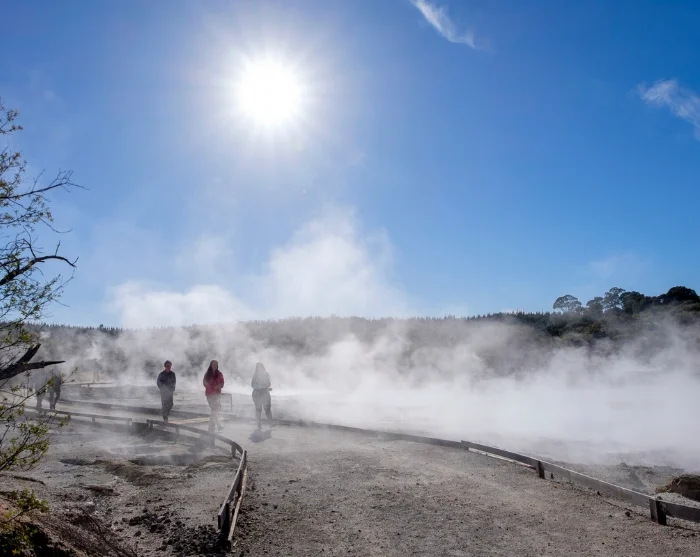 Ved ankomst starter du din selvguidede rundtur i parken, som tar omtrent 1–1,5 time. Du møtes av et landskap fullt av dampende svovelkilder, boblende gjørmepytter og kokende fossefall – alt omgitt av svovellukt, varme damptepper og krystalliserte mineralavsetninger. Ruten er tydelig merket og lett å gå, og underveis finner du informasjonstavler og utsiktspunkter som forklarer områdets unike geologi og maorienes betydning.