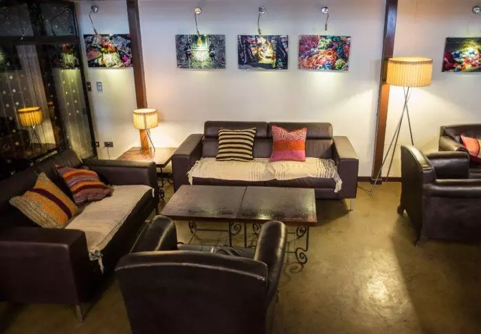 Fellesområdet er i to etasjer: nederst ligger lodgens bar og restaurant, der dine inkluderte måltider serveres. Maten her er veldig god, og en blanding av nasjonale- og internasjonale retter med fokus på bruk av lokalproduserte råvarer.