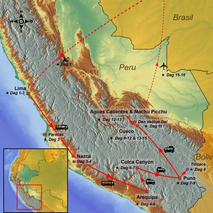 Peru er et utrolig spennende reisemål. Du begynner i hovedstaden Lima og fortsetter til mini-Galápagos, Islas Ballestas, hvor du kan oppleve spektakulære klippeformasjoner, blåfotede suler, pingviner og sjøløver. Fra denne øygruppen kan du også se La Candelabra på Paracas-halvøya. Ett av turens høydepunkter er Nazca-linjene, som bare kan sees fra luften. Du besøker “Den hvite byen” Arequipa og den dype dalen Colca Canyon. Ved verdens største innsjø, Titicacasjøen, møter du lokalbefolkningen og får innblikk i deres kultur og dagligliv. Reisen går videre til inkarikets gamle og elegante hovedstad, Cusco, samt Den hellige dal med stopp i museumsbyen Ollantaytambo og Pisac, kjent for sine markeder og imponerende ruiner. Et annet høydepunkt er det verdensberømte ruinområdet Machu Picchu, hvor du kan nyte den magiske utsikten mot høye fjell og tåkeskog før turen går tilbake til Cusco, hvor hjemreisen starter.