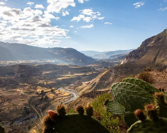 De neste par dagene får du virkelig oppleve de mektige Andesfjellene. Du krysser den spektakulære høysletten Altiplano. Den er kjent for sitt tørre, golde landskap med store åpne vidder der du kan få øye på beitende lamaer og alpakkaer. Flere steder kjører du i over 4 000 meters høyde. Det høyeste passet og utsiktspunktet på ruten heter Mirador de los volcanes, og herfra har du i klart vær en fantastisk utsikt til de omliggende vulkanene. Utsiktspunktet ligger i ca. 4 900 meters høvde, og du vil nok raskt merke at den tynne luften i denne høyden gjør det mer anstrengende å puste. Derfor blir det også bare et raskt fotostopp før du fortsetter ned mot byen Chivay, som fungerer som inngang til Colca Canyon.