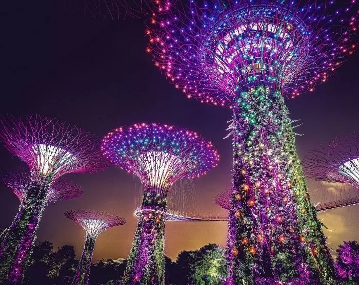 Mens du er i området, kan du velge å nyte den vakre utsikten over Gardens by the Bay, der lys- og musikkshowet Garden Rhapsody lyser opp hagen i alle regnbuens farger.