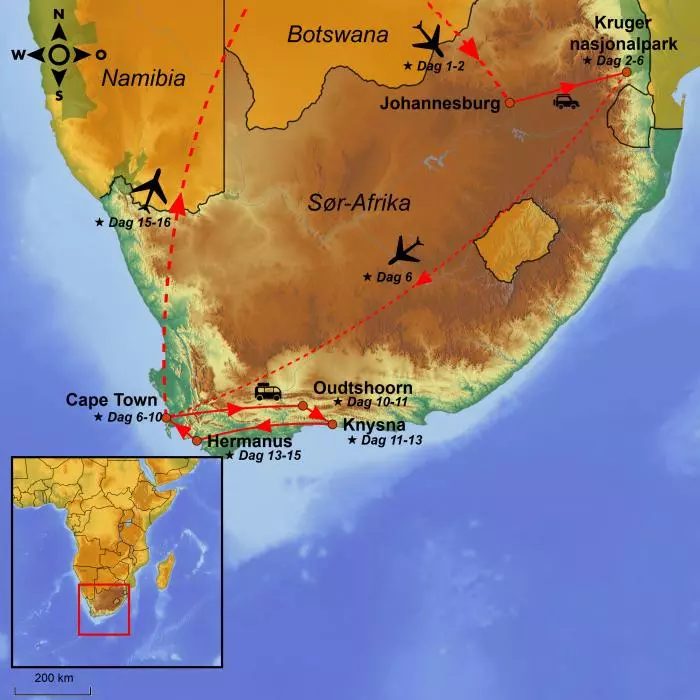 Fra safari i en av verdens mest dyrerike nasjonalparker, Kruger nasjonalpark, går turen til en av verdens vakrest beliggende storbyer, Cape Town. Her er dagene til fri disposisjon, så du kan oppleve akkurat det du har lyst til – men vi hjelper deg naturligvis også gjerne hvis du vil på utflukt.