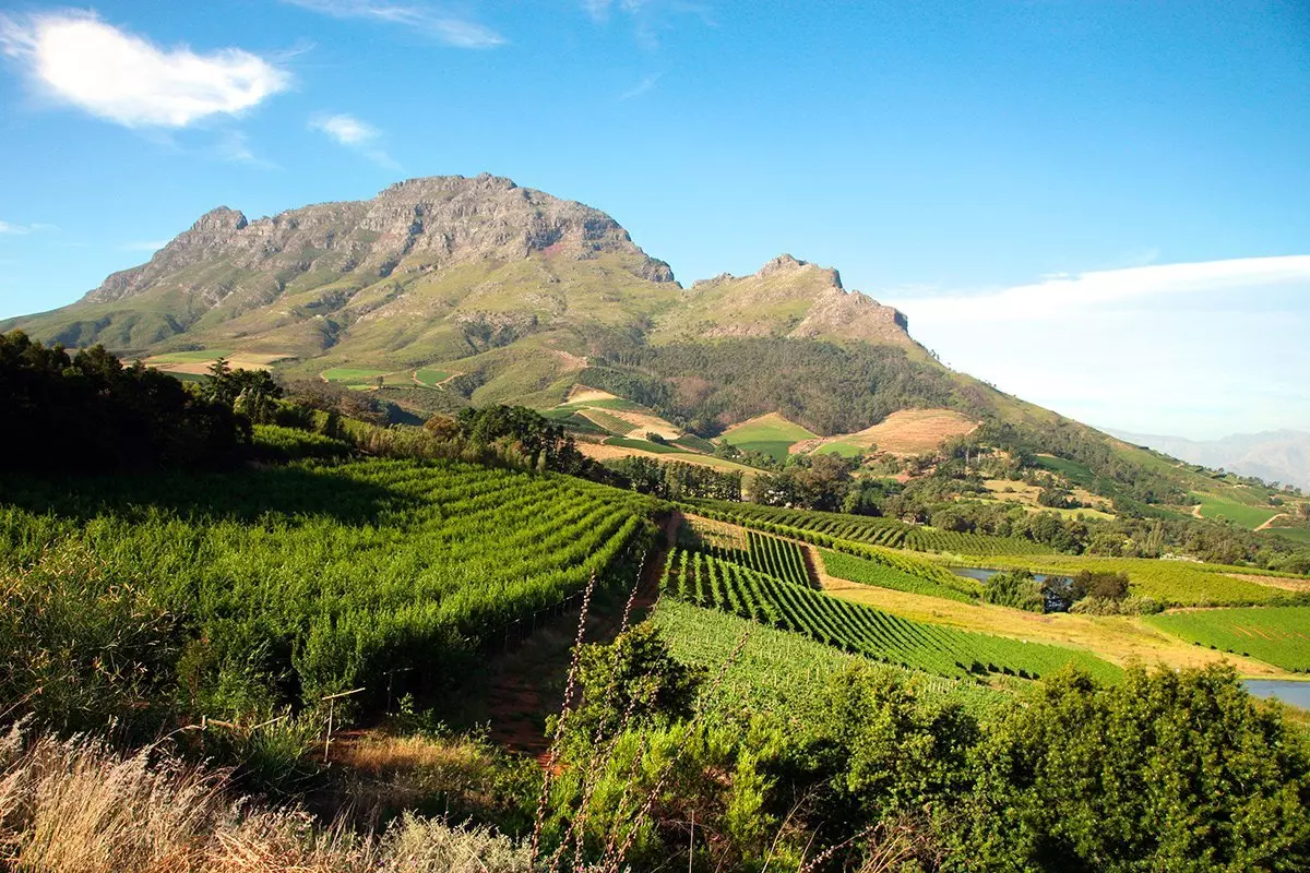 Fra Cape Town går turen nå til det frodige vinlandet. Det ligger bare en times kjøring unna, men du kommer til en helt annen verden. Her er det grønne vinmarker og hus bygget i den karakteristiske kap-hollandske stilen. I bakgrunnen kan du se fjellene. De er en medvirkende årsak til at dalene i Vinlandet er så godt egnet til vindyrking.
