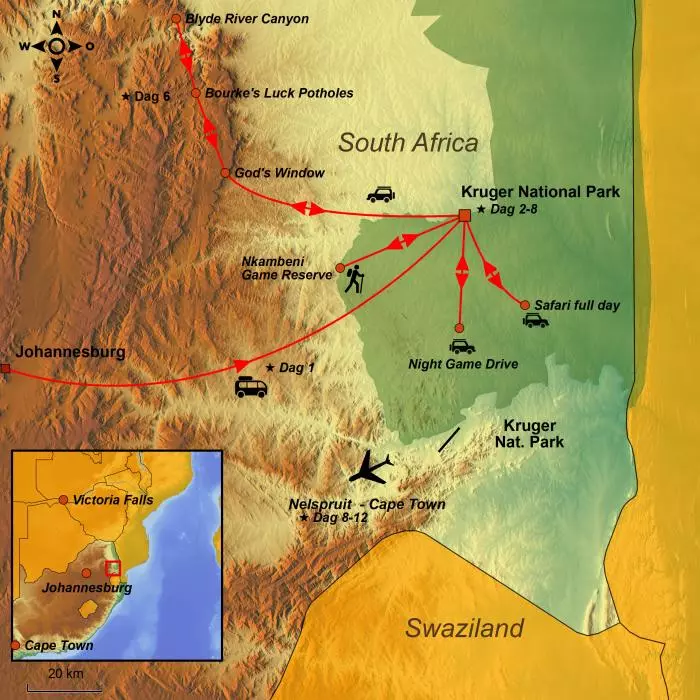 Du opplever Sør-Afrikas høyeste og lengste fjellkjede, Drakensfjellene. Nyt den spektakulære utsikten over et av turens høydepunkter, Blyde River Canyon, verdens tredje største kløft. Du opplever også utsiktspunktene God’s Window og Bourke’s Luck Potholes, der elvene Blyde og Treur har gravd ut dype, sylindriske formasjoner i klippene.