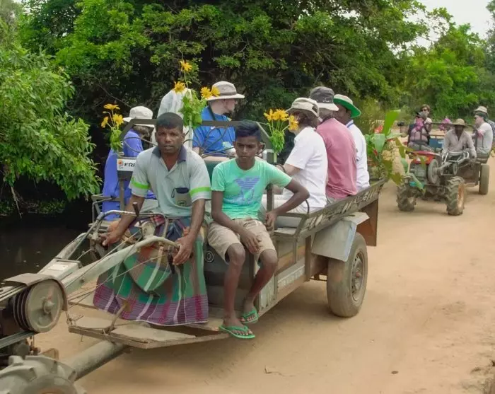 Guiden/sjåføren henter deg på hotellet, og du blir kjørt ut i det frodige landskapet på vei til landsbyen Hiriwadunna. Turen starter med en kjøretur i en UTV nær landsbysjøen, og deretter seiler du over den fredfylte sjøen som er dekket av vannliljer i en “oruwa”, srilankernes tradisjonelle båt. Etter den idylliske båtturen skal du gå en kort tur gjennom rismarkene, og her kan du kanskje se bønder som høster risen ute på jordene. Du kommer frem til et landsbyhus, og her treffer du familien og får mulighet til å smake på lokale spesialiteter og srilankisk te. Deretter kjører en tuk-tuk deg tilbake til turens startsted, der du sammen med landsbyboerne tilbereder din egen lunsj som består av en ekte, velsmakende srilankisk curry.