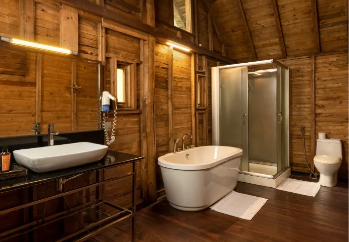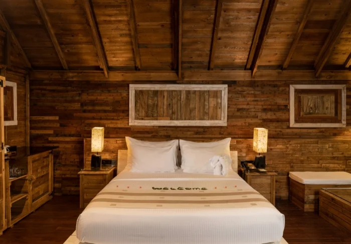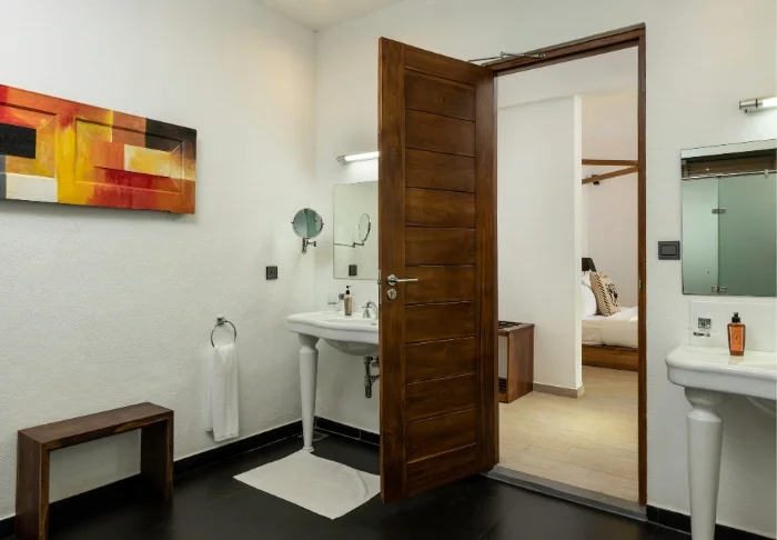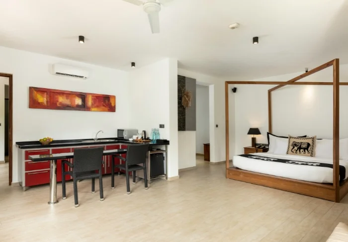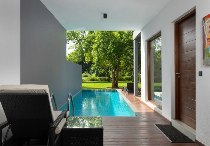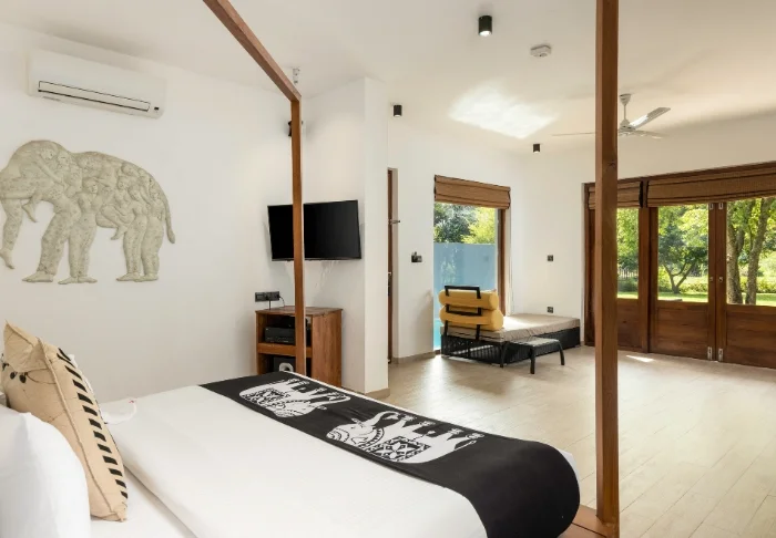 Du bor som utgangspunkt på et Deluxe-rom i moderne, minimalistisk stil, der lyse farger og srilankiske detaljer skaper en harmonisk balanse mellom enkelhet og lune omgivelser. Her har du både aircondition, Wi-Fi, TV, sikkerhetsboks, skrivebord, sittegruppe, telefon og minibar tilgjengelig, mens badet er utstyrt med både badekar og dusj, i tillegg til tilhørende badeprodukter. I tillegg har du tilgang til din egen balkong, hvor du kan nyte hagens fredelige atmosfære med en god bok i hånden.