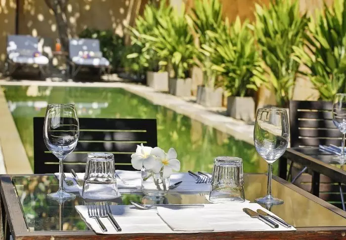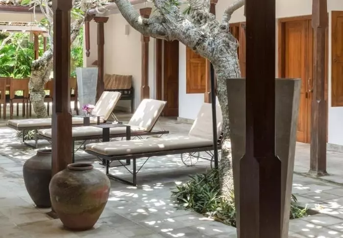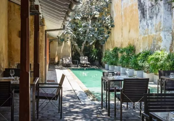 Hotellet har en idyllisk bakgård med flotte plumeriablomster (frangipani) som står i perfekt kontrast til de sjarmerende, gamle gule murene. Her er det også et lite basseng med tilhørende liggestoler.