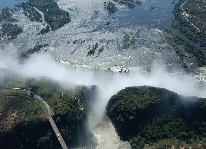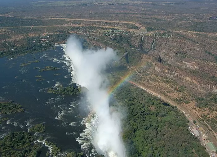Det kan du til gjengjeld fra luften! Ovenfra får du også et spektakulært utsyn over de mange kløftene som de enorme vannmengdene har hult ut gjennom tidene. En lang helikoptertur gir naturligvis flere muligheter for å ta virkelig gode bilder, men selv en kortere tur på 10 minutter kan by på fantastisk utsikt og gode muligheter til å fotografere vannfallet i hele dets lengde – inkludert de flotte regnbuene som nesten alltid dannes i vanndråpene fra de enorme vannmengdene. Det er ikke uten grunn at Victoria-vannfallene på det lokale språket heter Mosi-oa-Tunya – som betyr ”Røyken som tordner” (”Smoke that thunders”).