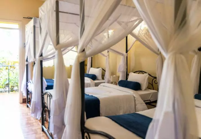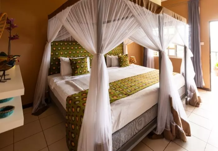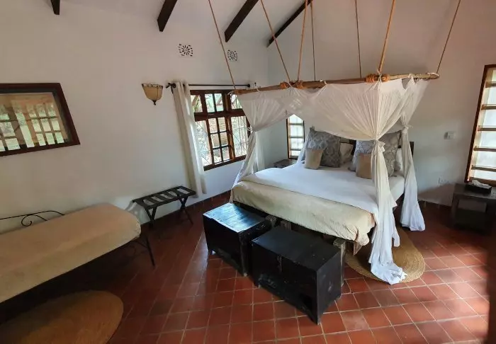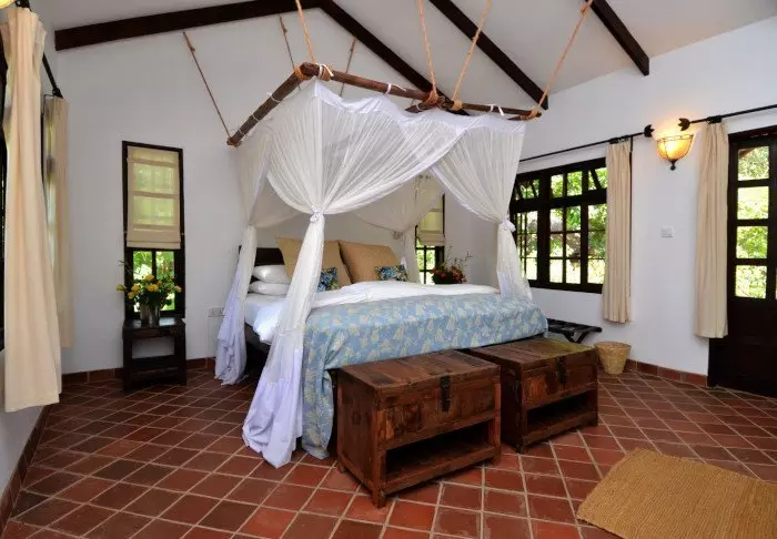 Dette er en liten, eksklusiv lodge med kun 24 hytter i sjarmerende kolonistil samt 12 rom i hovedbygningen med terrasse eller balkong som alle ligger ut mot hagen. Alle rom har bad med dusjkabinett og i tillegg takvifte, te/kaffe-brett og myggnett. Det er mulig å bestille room service.