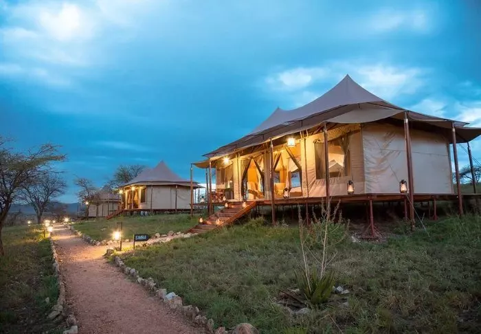 Teltene er store og har god plass og mye luft rundt de to kingsize-sengene. Fra oppholdsrommet kommer du rett ut på en stor, gjennomgående veranda, og herfra har du den mest fantastiske utsikten over Serengeti Plains. Alle teltene har eget bad med toalett og dusj. Det er også et badekar der du kan ligge og slappe av med direkte utsikt over nasjonalparken. Det er også privat utendørsdusj, og også herfra er det flott utsikt over Serengetis sletter.