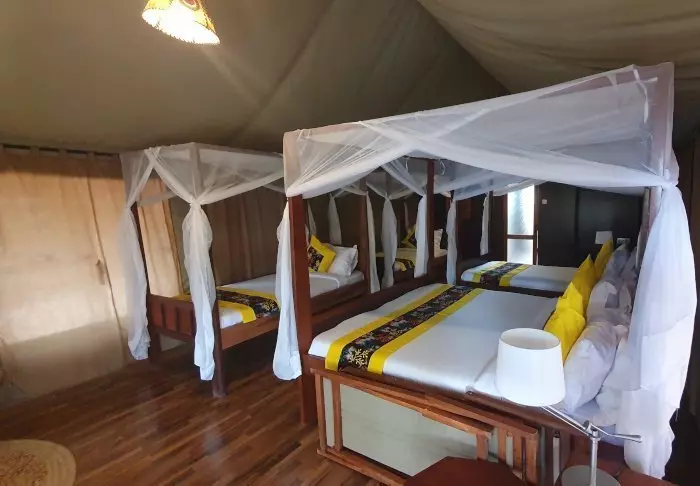 Her er det 24 telt med plass til 2 eller 3 personer i hvert telt. Teltene er store, og alle har dusj og toalett, skrivebord og store senger med myggnett. Hvert telt har dessuten en liten ”terrasse” med hagestoler, der du kan slappe av og nyte de fantastiske omgivelsene. I tillegg er det et stort fellestelt som blir brukt som spisetelt.