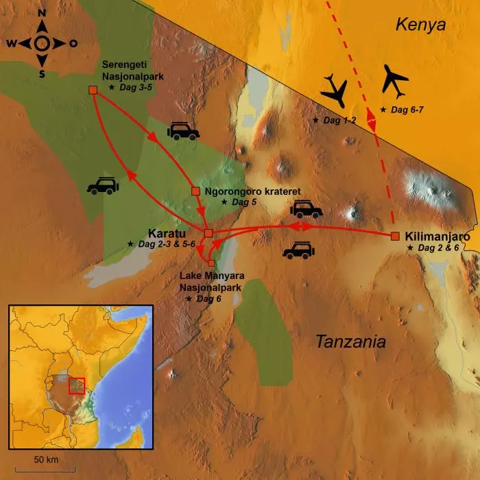 På denne reisen får du se alle de viktigste høydepunktene en safarireise i Tanzania kan by på: Serengeti nasjonalpark, Ngorongoro-krateret, Ngorongoro Conservation Area og Lake Manyara nasjonalpark. Her har du muligheten til å oppleve alle Afrikas berømte dyr på en kort og kompakt safarireise. Du skal bo på hotell, men også i en teltleir der du virkelig får nærkontakt med den storslåtte afrikanske naturen. Teltene har ordentlige senger og eget bad og toalett. Dette blir et høydepunkt på reisen din.