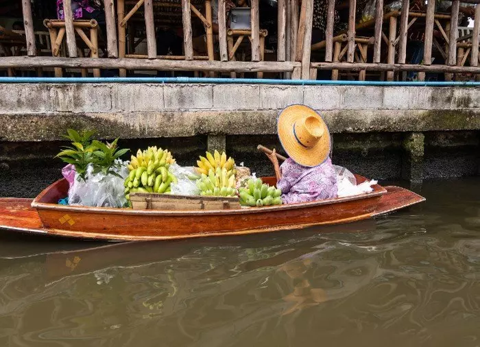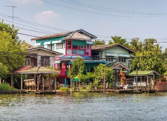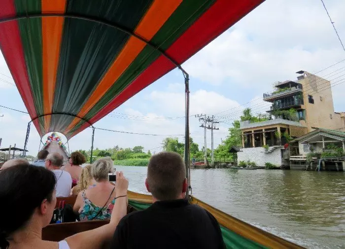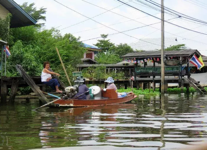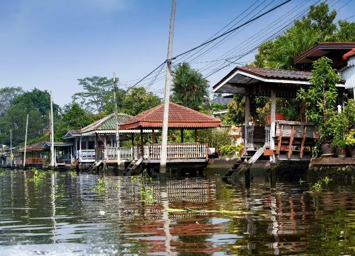 Herfra går du den korte veien ned til Kongenes elv, Chao Phraya, der du går ombord i en liten motorbåt. Båten tar deg med til bydelen Thonburi i den vestlige delen av Bangkok via en labyrint av kanaler, også kalt “klonger”. I gamle dager foregikk det meste av den daglige handelen i Bangkok på og langs kanalene, og trafikken var så stor at tidligere europeiske handelsreisende og besøkende ga byen navnet “Østens Venezia”. Kanalene er fremdeles meget viktige for lokalbefolkningen, og her er det utrolig frodig, fredelig og sjarmerende. Langs kanalene står husene på pæler, og små trapper leder ned til vannet. Her kan du se lokalbefolkningen vaske håret eller skylle klær. Ute på verandaene kan du ofte se småbarn sammen med bestemødre som venter på at båten med postbudet eller isselgeren skal komme. Denne delen av Bangkok er på alle måter en total motsetning til sentrum av Bangkok. Her finner du verken tett bebyggelse, skyskrapere, kabelbaner eller motorveier.