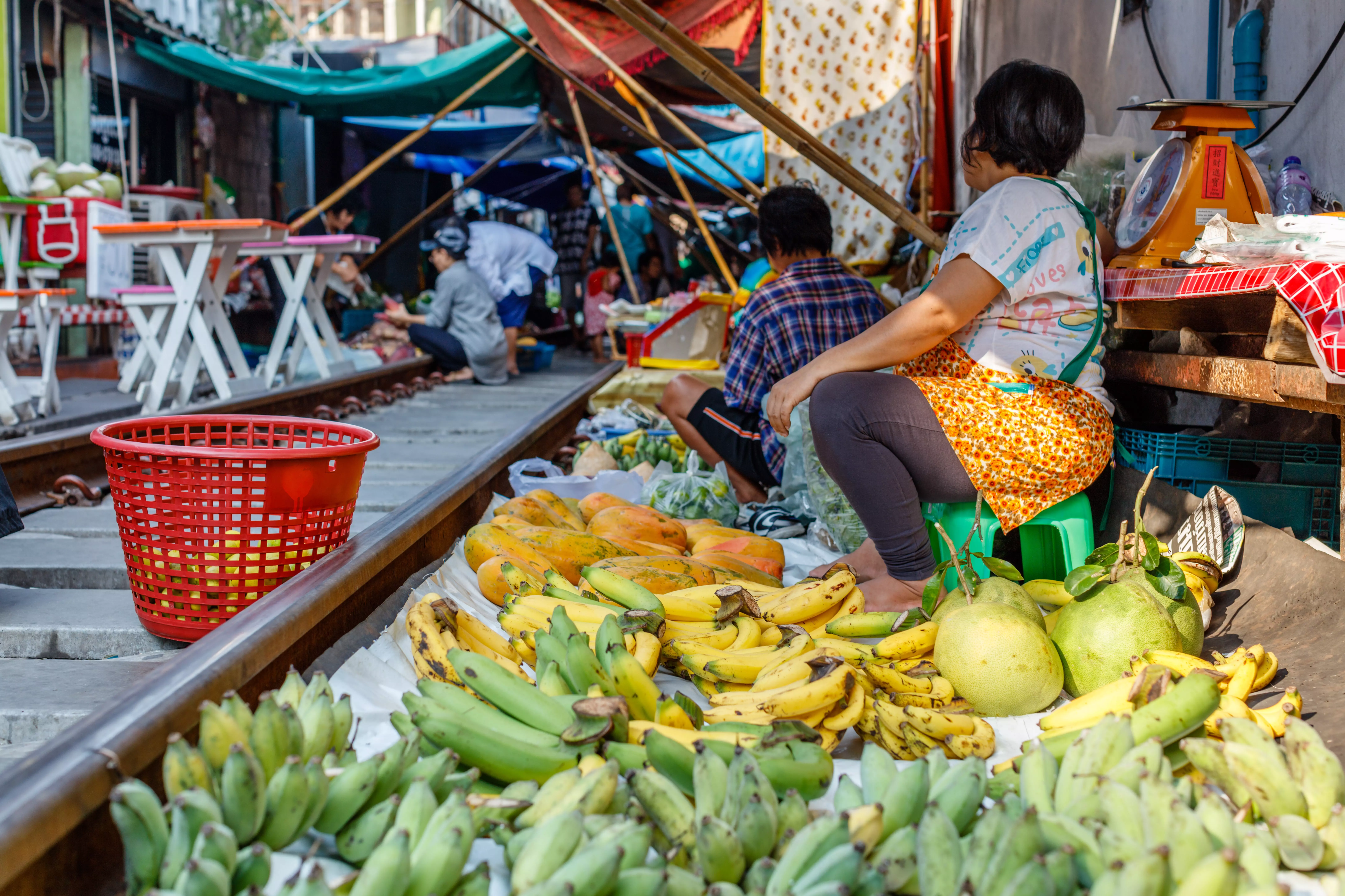Etter litt over en times kjøring kommer du frem til Maeklong, hvor du får oppleve et travelt marked der det selges frisk frukt, grønnsaker, krydder, kjøtt, fisk og suvenirer – og mye mer. Det mest fascinerende med markedet er at det delvis går langs et jernbanespor. Når et tog sakte nærmer seg, blir du henvist bak de røde linjene for å sikre at du står i trygg avstand. Markedsselgerne har utviklet en effektiv metode for å pakke sammen markisene og varene raskt og koordinert for å gi plass til toget – og det er et herlig syn. Hvis det blir tid til det, kan du ta turen ned til Maeklong stasjon, der toget stopper til det har avgang i motsatt retning. Et steinkast unna jernbanestasjonen (og turistene) finner du små, sjarmerende boder der du kan kjøpe en iskaffe, thailandsk te eller den tradisjonelle thailandske desserten «khanom krok».