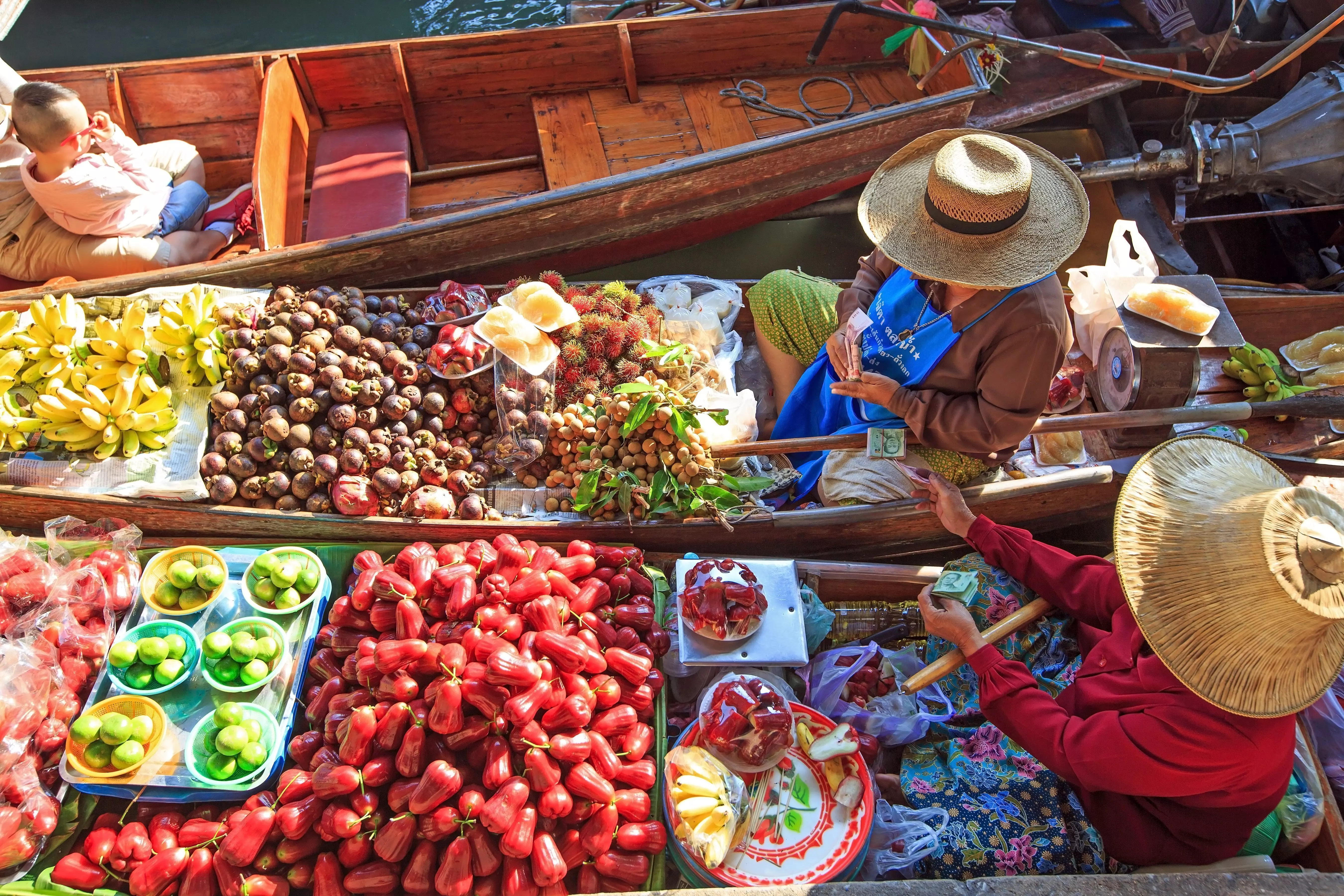 Du går om bord i en tradisjonell langbåt som tar deg gjennom kanalene, forbi trehus som står på stylter og inn i selve Damnoen Saduak-markedet. Langs kanalene er det satt opp treboder med suvenirer og malerier, og selgerne seiler rundt med alt fra blomster til fargerik frukt og kokosiskrem. Ta inn den kaotiske og sjarmerende atmosfæren – kanskje faller du for noe du bare må ta med hjem.
