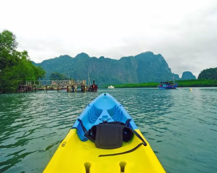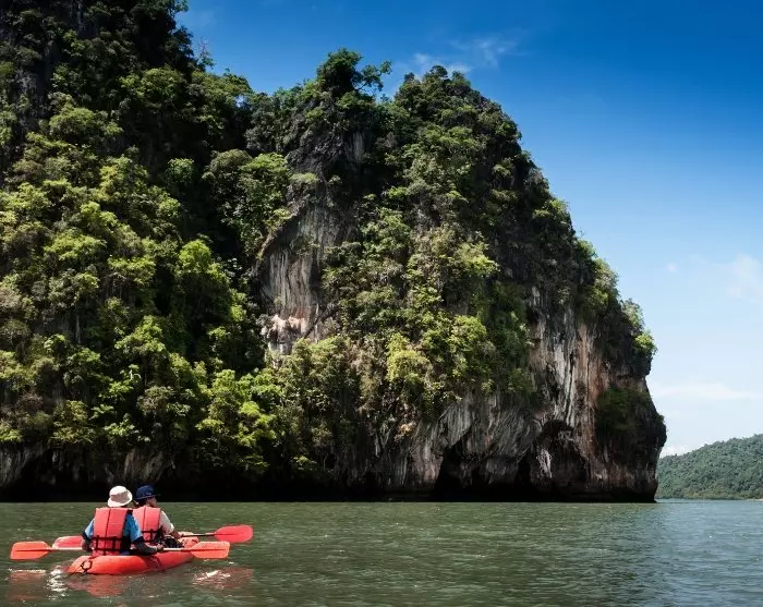 Turen går videre med en liten motorbåt, til øyene Koh Aung og Koh Talabeng med ikoniske kalksteinsklipper og idylliske bukter. Ved Koh Talabeng venter en uforglemmelig kajakktur rundt øya, og du opplever områdets uberørte natur, storslåtte kalksteinsklipper og fascinerende grotter.