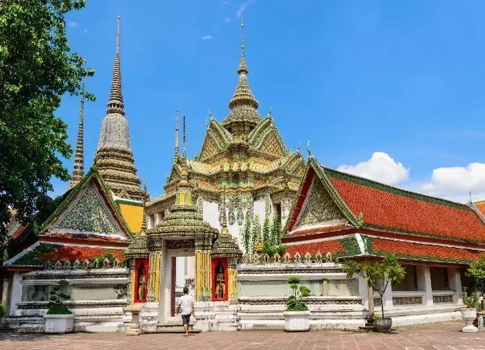 Herfra går dere til turens første stopp ved det utrolig vakre templet Wat Pho, Bangkoks største og eldste. Wat Pho var opprinnelig Thailands første offentlige universitet, og det var også en av landets første skoler der det ble undervist i thaimassasje. Templet utgjør et større anlegg av forskjellige tempelbygninger samt et kloster med 300 munker. Wat Pho er spesielt berømt for sin gigantiske liggende Buddha av gull som er 46 meter lang og 15 meter høy. Buddhaen ble laget av gips og murstein og deretter dekket med bladgull. Tempelet har dessuten den største samlingen av Buddha-statuer.
