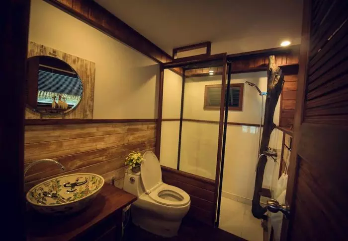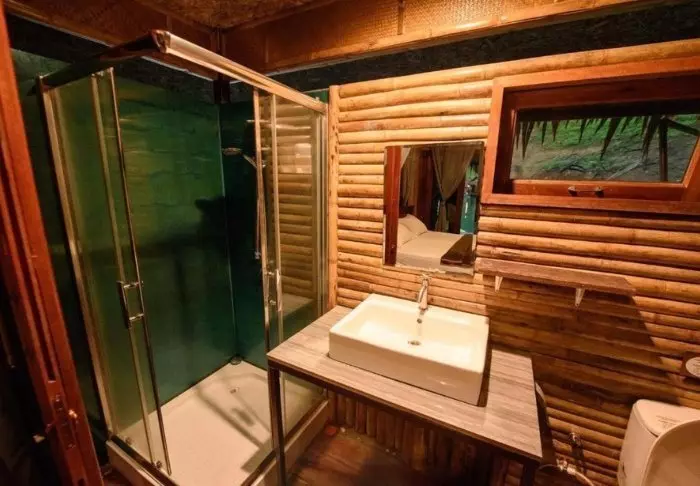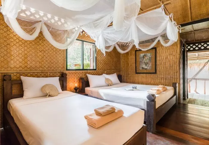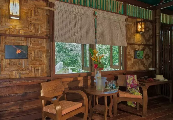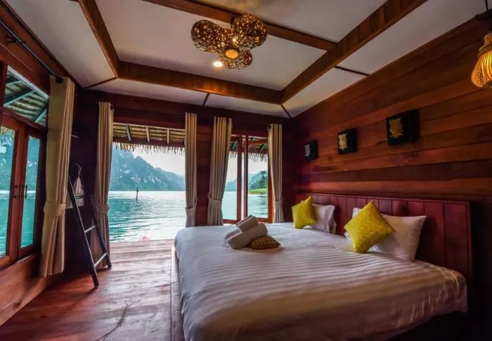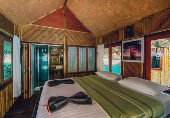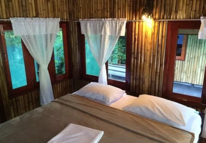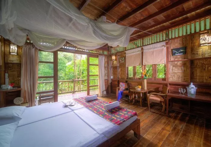 Flotellet har to seksjoner med totalt 100 bambushytter. Rommene er enkelt innredet med komfortable senger og myggnett, håndholdt vifte, lommelykt, sminkebord, flaskevann og redningsvest. Rommene har ikke elektrisitet, og derfor heller ingen minibar eller Wi-Fi. På verandaen din kan du slappe av i en hengekøye mens du nyter utsikten over den rolige elven med gigantiske bambusplanter langs bredden og ville orkideer i treetoppene. Du kan også ta en forfriskende dukkert direkte fra verandaen eller padle i kano. Alle rom har dessuten eget bad med toalett, toalettartikler og kaldt vann i dusjen.