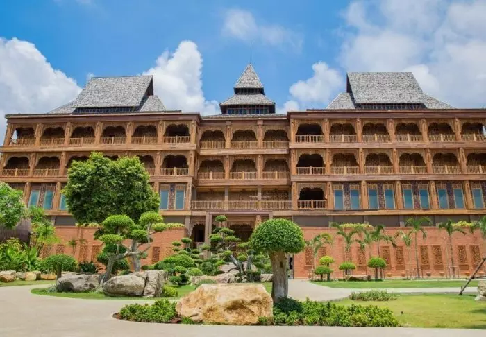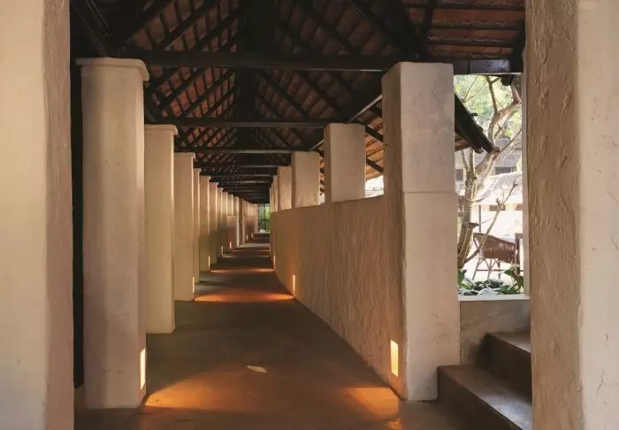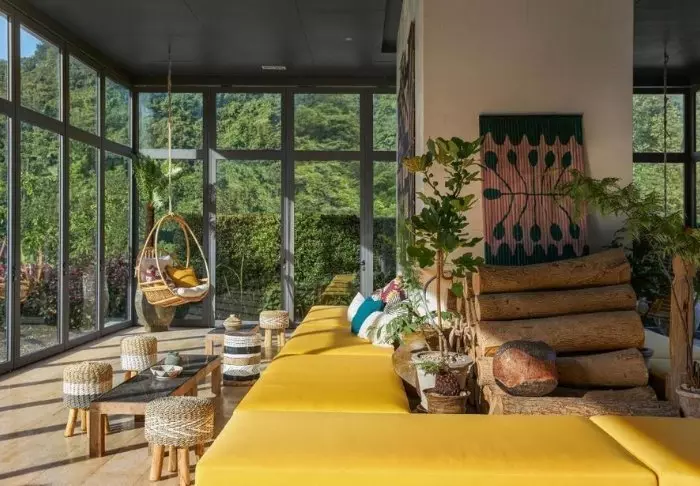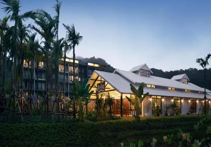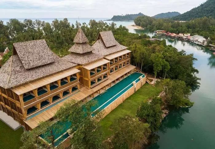 Resorten er bygget av tre og har en flott arkitektur som passer perfekt inn i den omliggende naturen.