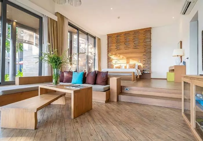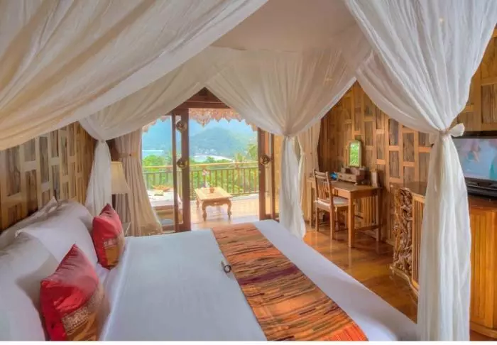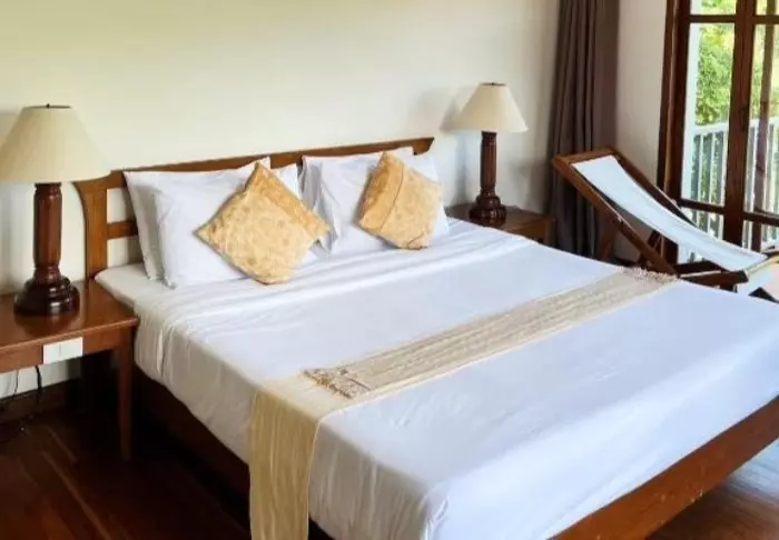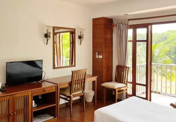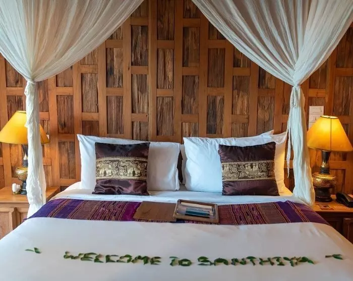 Innkvarteringsmulighetene på Santhiya er bare helt fantastiske. Hvert rom og hver villa har sin egen unike sjarm og utsøkte detaljer. Mange av dem har en fantastisk utsikt over bukten og havet, og noen har til og med privat basseng. Dette skaper en perfekt ramme for en romantisk eller avslappende ferie sammen med familien. Alle rom er vakkert innredet med autentiske detaljer utskåret i tre samt moderne fasiliteter som aircondition, Wi-Fi, flatskjerm-TV, minibar og safe. Over sengen er det også myggnett. På det flotte badet finner du toalettartikler, hårtørker, badekåpe og tøfler. Om morgenen kan du starte dagen med en kopp kaffe på din romslige balkong med daybed og taktvifte.