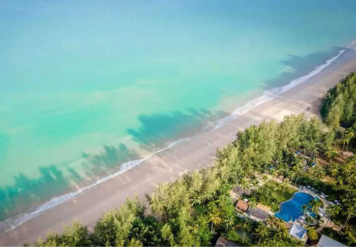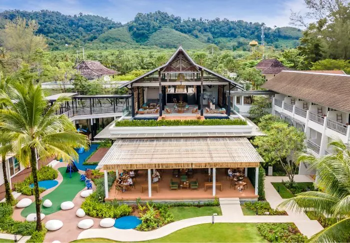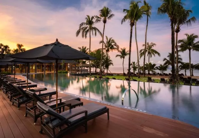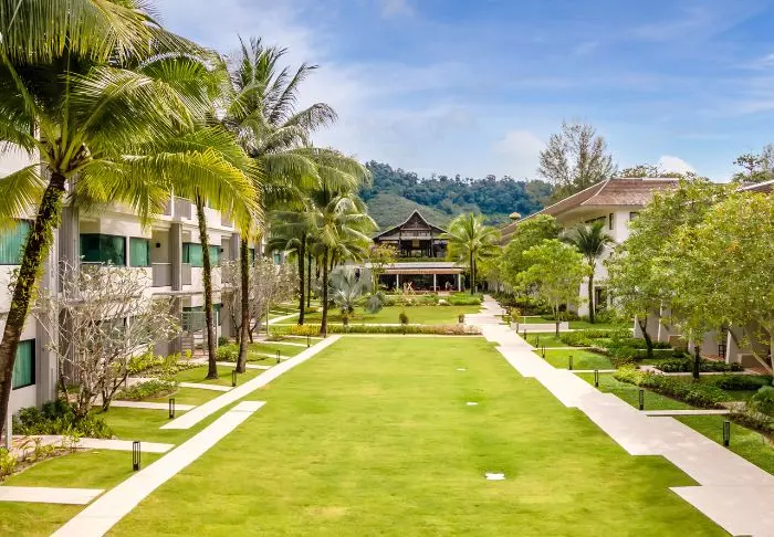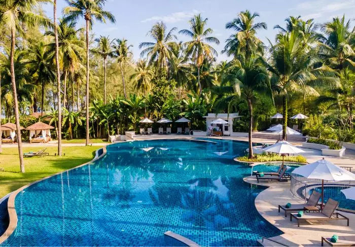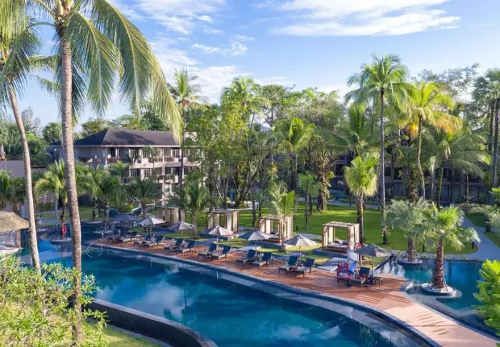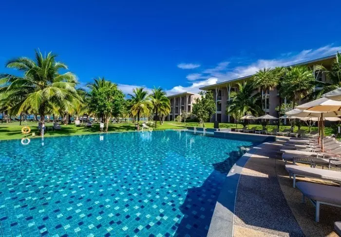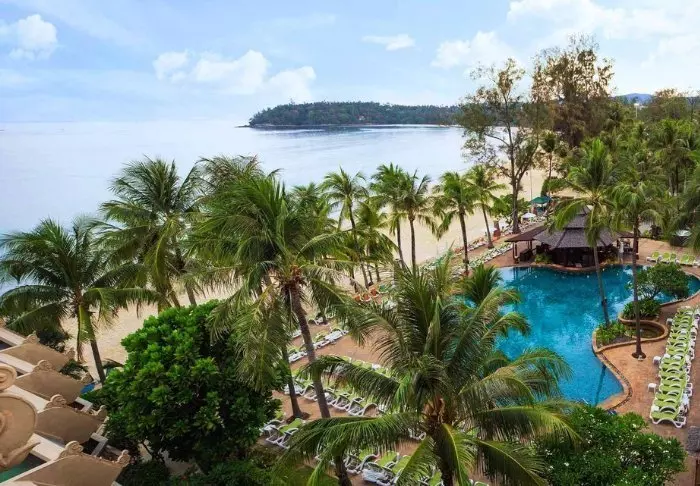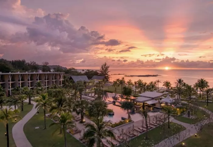 Foran frodige fjell og mellom vaiende kokospalmer finner du Outrigger Khao Lak Beach Resort, som ligger helt nede vedl Bangsak-stranden med utsikt over Andamanhavet.