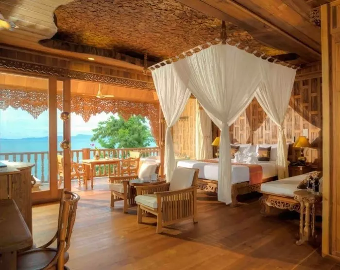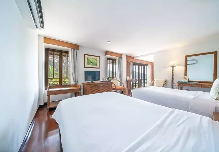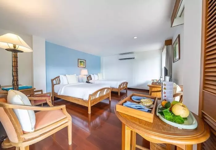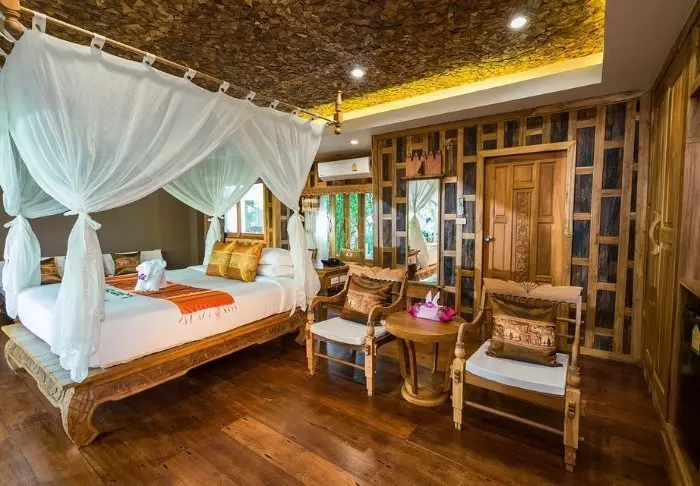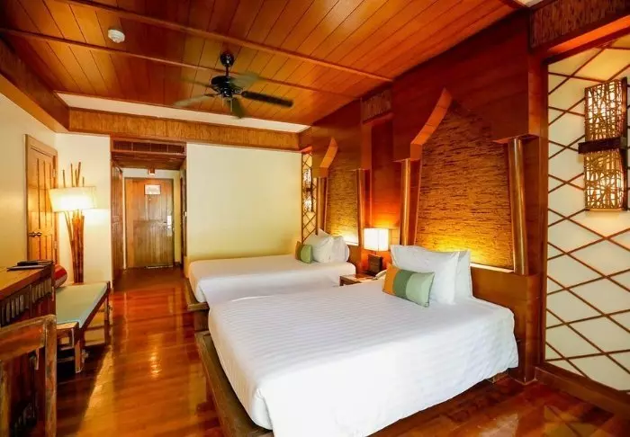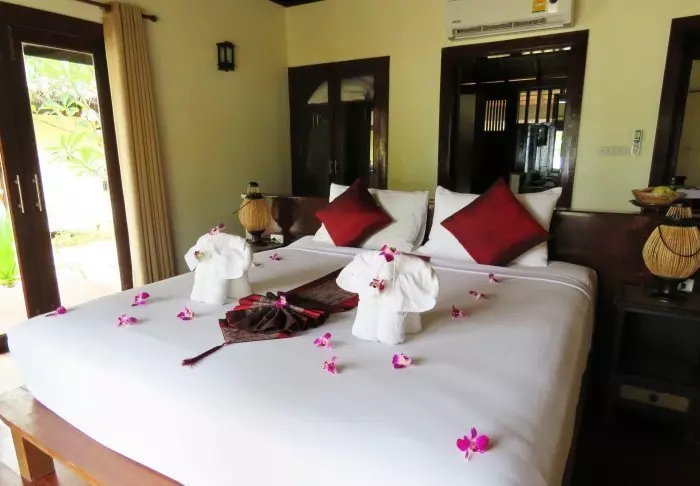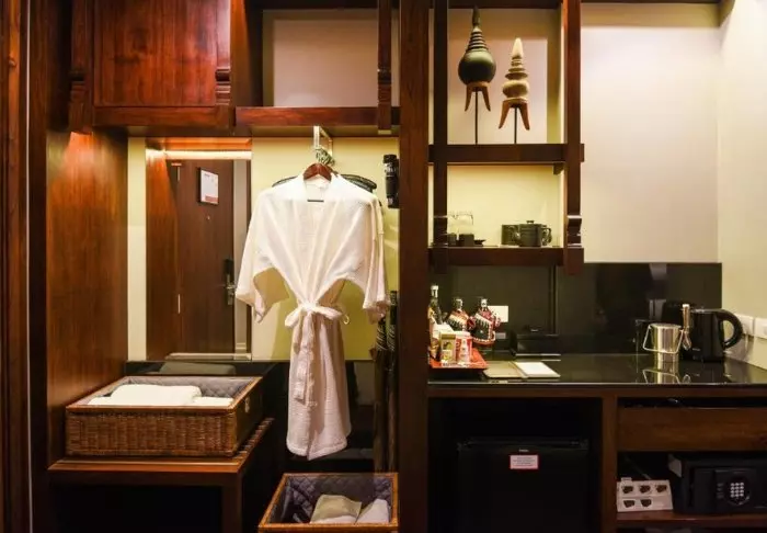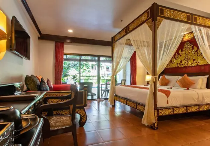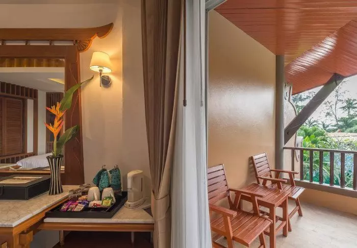 Rommene er også innredet i thai-stil med vakre treutskjæringer og flotte mønstrer på puter og tepper. Her er det TV, kaffe- og tefasiliteter, aircondition, safe, minibar, hårtørker – og en paraply, hvis det skulle komme et tropisk regnskyll. Alle rom har egen balkong.